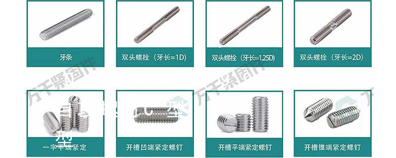 螺栓有:1、方頭螺栓,2、半圓頭方頸螺栓,3、十字槽盤頭螺釘,4、內六角沉頭螺釘,5、方螺母C級,6、蝶形螺母,7、六角頭螺栓,8、十字槽盤頭自攻螺釘。大小有M18、M6、M8、M16、M10、M12、M14、M20等型號。通常用