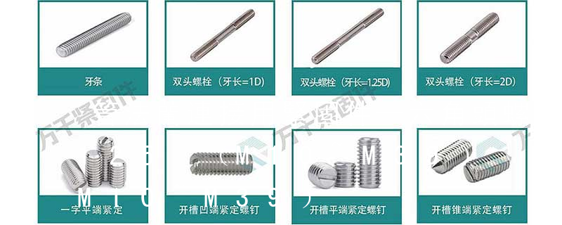 螺栓有:1、方頭螺栓,2、半圓頭方頸螺栓,3、十字槽盤頭螺釘,4、內六角沉頭螺釘,5、方螺母C級,6、蝶形螺母,7、六角頭螺栓,8、十字槽盤頭自攻螺釘。大小有M18、M6、M8、M16、M10、M12、M14、M20等型號。通常用